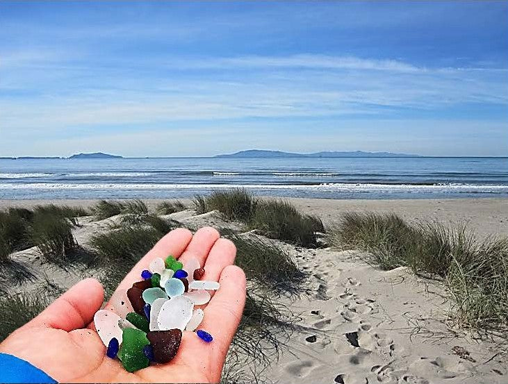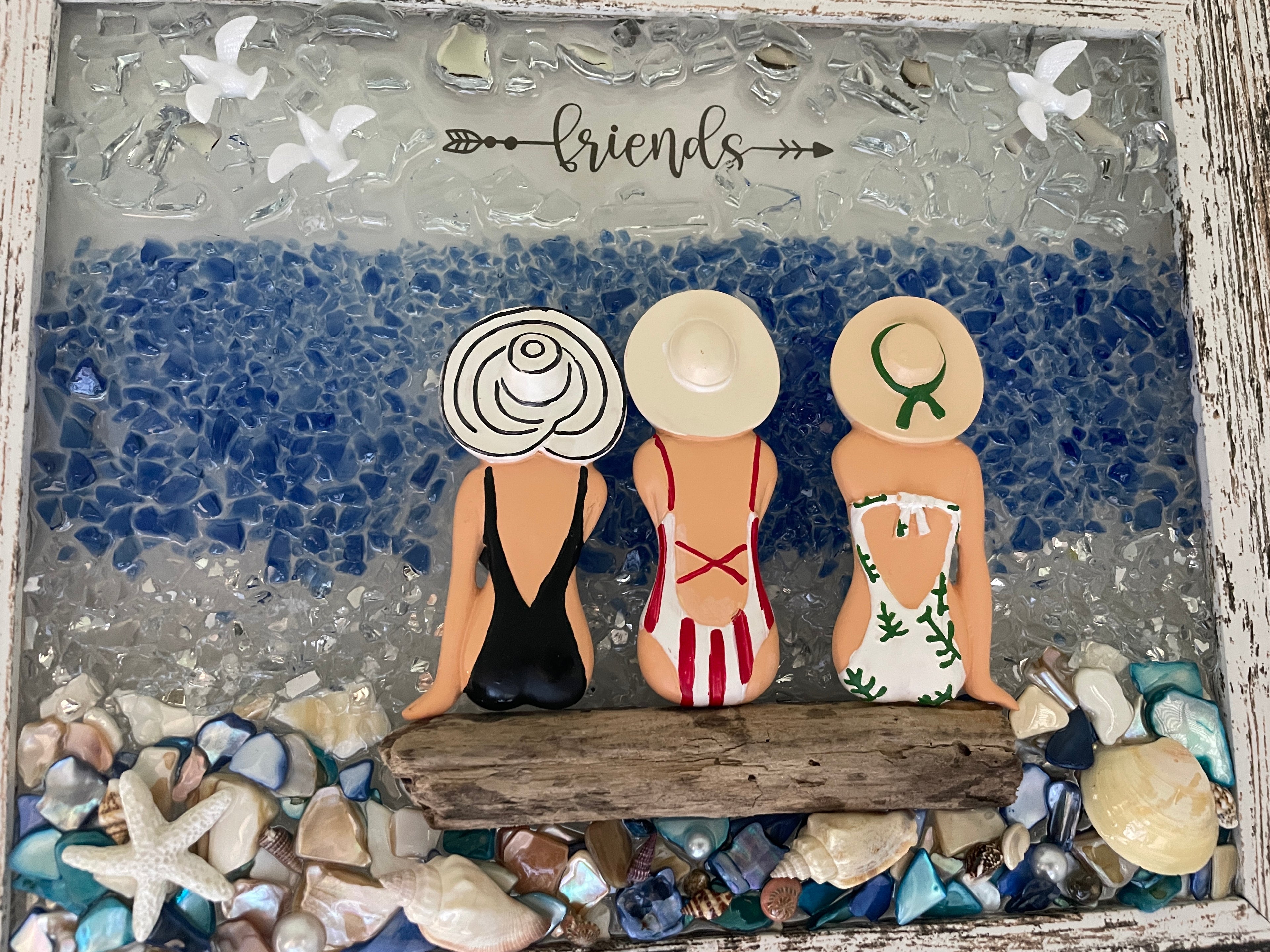 Beach Friends Crushed Glass Art - Two Friends on Driftwood Log (8" x 10")